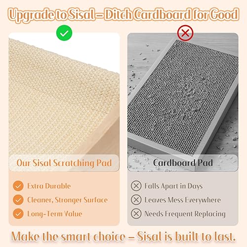 Upgrade to Sisal: Our durable sisal cat scratcher pad outperforms flimsy cardboard cat scratchers and cat cardboard scratch boards. Say goodbye to messy, easily damaged cat scratcher cardboard and enjoy a cleaner, long-lasting cat furniture
