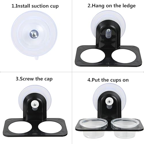 INSTALLATION STEPS: as picture 3 shows, loosen the nut from the thread rod after you received the product. 1.Attach the suction cup on the cleaned glass/acrylic surface first. 2.Put the feeder ledge on the thread rod. 3. Screw the nut onto the thread rod to tighten it, the suction cup will create a vacuum when you screw it. This way will be more stable for your pets feeding.4.Finally put the cups on. Please note a cleaned terrarium tank surface is necessary.