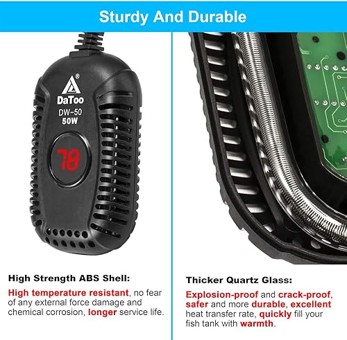 Sturdy And Durable -- High strength ABS shell, no fear of any external force damage and chemical corrosion, high temperature resistant, longer service life. Thicker quartz glass, explosion-proof and crack-proof, safer and more durable, excellent heat transfer rate, which enables DaToo aquarium heaters to quickly fill every corner of your fish tank with warmth!