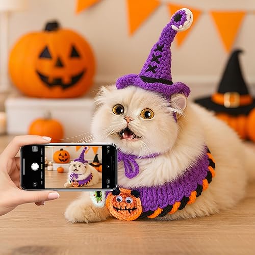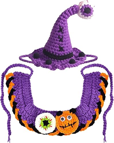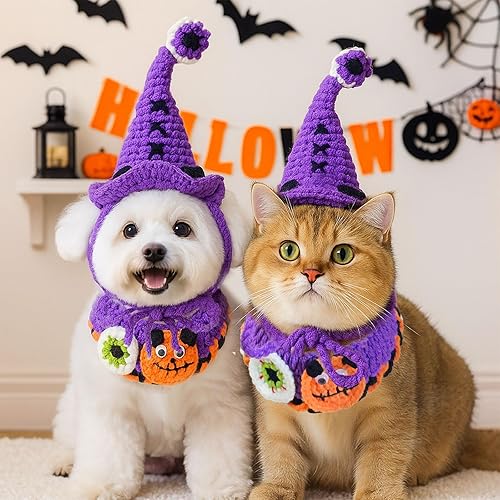 Funny Small Dog Wizard Hat and Scarf Set: There is a knitted puppy bib and wizard hat in the package. Lacing up design for easy adjustment to better fit your dogs and cat body. The cat witch hat features an ear-hanging design, can be worn more firmly on pet's head and not easy to fall off. The small dog cat apparel has a cute pumpkin and scary eyeballs pattern on it, full of Halloween atmosphere. It is a great pet costume for Halloween party