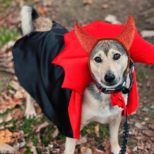 Scary Vampire Pet Costume: The Halloween dog cat costumes feature reversible black-red dog vampire cloak comes with a stylish stand-up collar. Small dog vampire cape is captures the perfect mix of spooky and domineering. Glitter red devil ears headband is easy to match perfectly our cat wizard cape or other Halloween dog outfit, make your pet look like a mysterious and cool witch/vampire/devil. Create a spooky and fun Halloween atmosphere