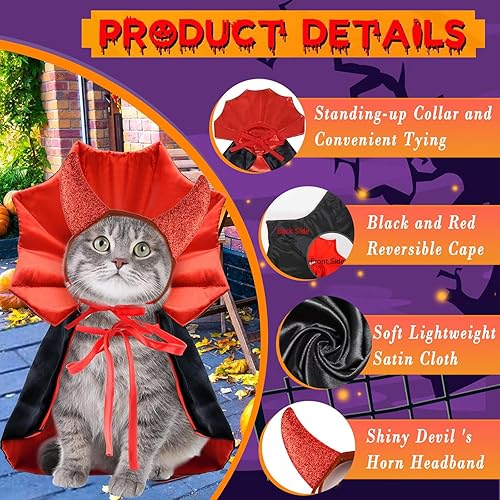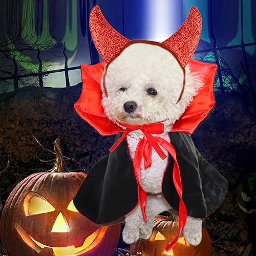Dog Halloween Costumes Set: You will receive 1 PCS pet vampire cape and 1PCS puppy demon hair accessories. Completed Halloween cat outfits set. Devil costumes for puppy kitten, crafted with its vampire style and distinct demonic elements. Let your furry friend enjoy the following Halloween day with you