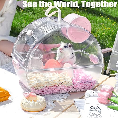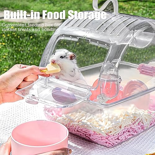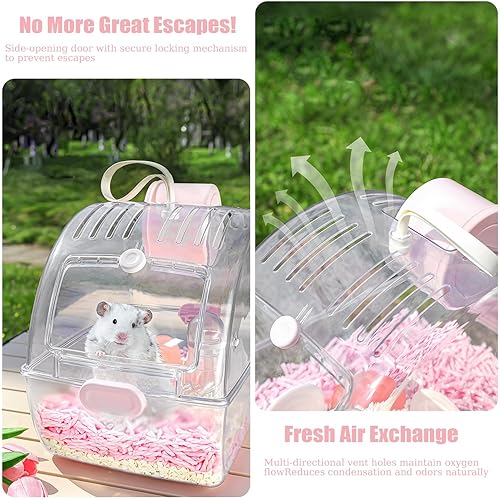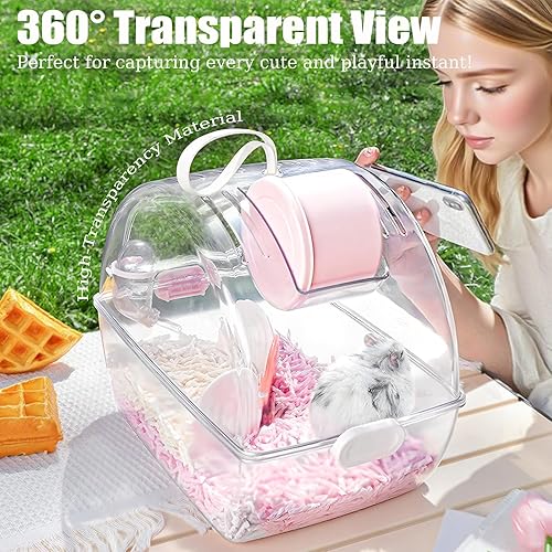 【360° Crystal-Clear Panoramic View】Our small portable hamster cage is meticulously crafted from premium transparent acrylic material, offering a 360° unobstructed panoramic view that allows you to observe your pet's every move from all angles. The ultra-clear top design provides complete visibility for monitoring during travel, while the slightly frosted lower space ensures privacy, perfectly satisfying your hamster's natural hiding instincts.