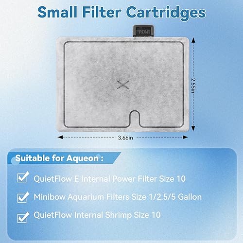 Perfectly Fit and Compatibility: There small replacement filter cartridges for aqueon comes in a pack of 8 (Unit Size: 3.66*2.55), custom-designed to fit Aqueon QuietFlow E Internal Power Filter Size 10 and Minibow Aquarium Filters Size 1/2.5/5 Gallon