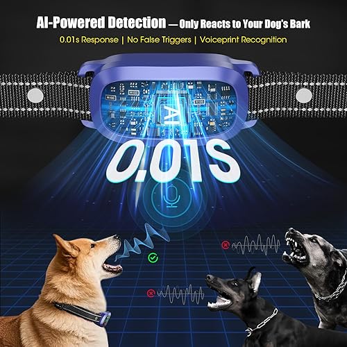 Advanced AI Chip & Instant Bark Detection: Upgraded anti barking device with smart AI technology and voiceprint recognition. The bark collar for dogs responds in just 0.01 seconds, filters out other noises, and prevents false triggering for precise and safe bark control