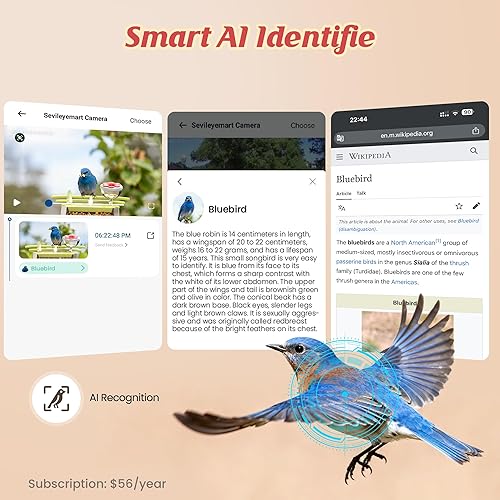 【AI bird identification】Discover nature's wonders with AI bird identification (subscription required) that recognizes 10000+ species like cardinals/hummingbirds with 98% accuracy. Get instant Alerts on your phone when rare birds visit your backyard;Supports SD card storage/cloud storage(SD card 2-128G),can record 20S video;2 way Audio--Live stream allows you to listen the voices of bird and turn on the microphone to communicate with them.Your yard will be visited by cute bird neighbors.