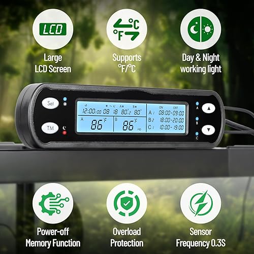 Day & Night Temperature Control: This digital temperature controller adopts independent temperature control for day and night, you can set the time period of day and night as well as the temperature range, effectively simulating the temperature variation, can be used with heat lamps, UVB lamps, heating pads, etc