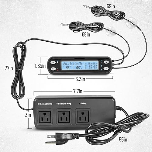 Timer & Thermostat: Reptile thermostat 2-channel temperature & timing control and 1-channel timing control, This means that you can control the temperature of 2pcs heating devices and timing 1pcs UVB device at the same time, which can maximally satisfy the environmental needs of reptiles for temperature, lighting, and more. Operating Voltage: 100-240V~50/60Hz, Output Efficiency: Max 300W,Support ℃/℉ switching
