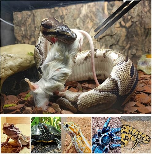 JUST RIGHT DIMENSIONS - Although not super long but just right, prevent any finger bites, Use them to feed the python. straight tweezers 10.6 inch; curved tweezers 10.6 inch, with a slanted tip for optimal feeding angle.