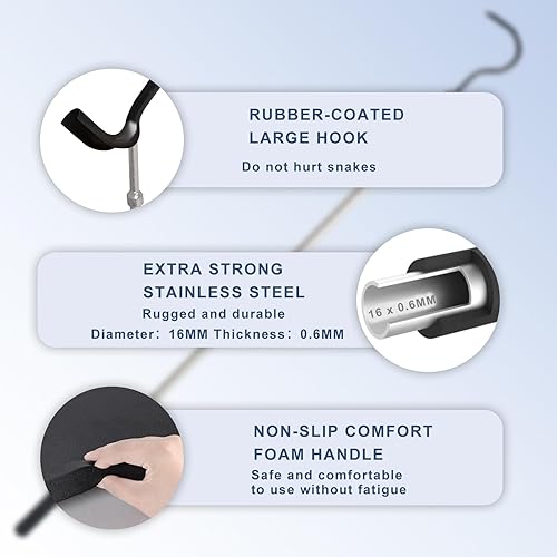 STRONG AND DURABLE:This snake hook for ball python is made of high-strength stainless steel material, strong and durable, and can hold up to 8lbs. The snake stick hook's handle is equipped with a comfortable, non-slip foam grip that provides a firm grip in wet weather or sweaty conditions, ensuring safe operation.