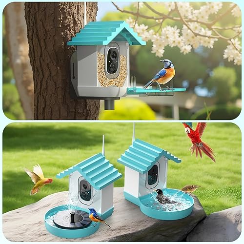 2-in-1 Bird Buffet Station with Smart Fountain Control: Upgrade your bird hospitality with our all-in-one feeding system! The 1.2L seed container and 800ml water basin, while the AI-controlled solar fountain creates natural drinking and bathing rhythms. Adjustable perches accommodate birds of all sizes—from doves to hummingbirds.It features a lightweight design (4.2lbs) for easy portability and IP65 weatherproofing, making it perfect for freestanding placement in any backyard.