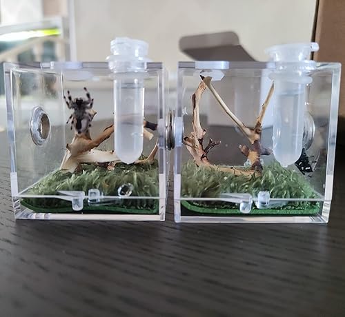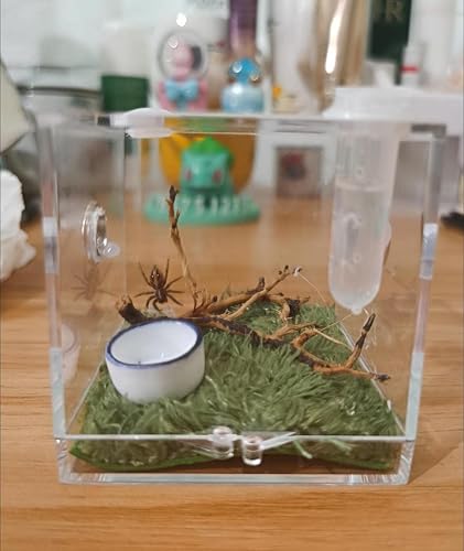 package include 1 small spider cage(2.7×2.7×2.7inch), 1 simulated turf,1 ceramics bowl, 1 dropper,1 tweezer,1 Driftwood. Suitable for arboreal tarantulas, crickets, snails, praying mantis, spiders, scorpions, praying mantis, house lizards, frogs, corn snakes, beetles, hermit crabs and other small insects.