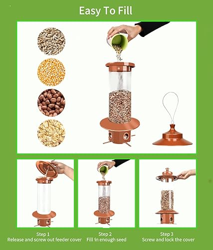 Refill Seed In Minute: screw the cover off feeder in counterclockwise, pour in enough seed and locked again