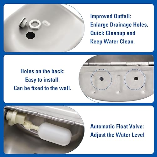 Ease To Use : Here is a drain plug at the bottom to flush dirty water; 2 holes at the back are convenient to attach this waterer to the wall (mounting screws not included); polished and curved edges.