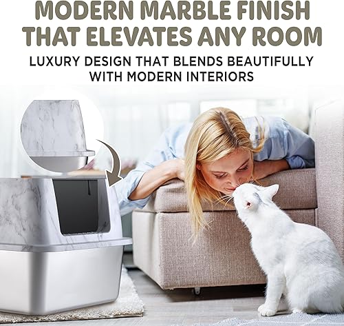 Luxury Marble Design Stainless Steel Litter Box – Odor-Free: Upgrade your stainless steel cat litter box! Unlike plastic litter boxes, this metal litter box resists stains, odors, and leaks. A large stainless steel litter box that’s Pure, durable, and ideal for multi-cat households.