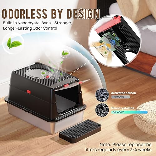 Built-In Carbon Filter Pouch: Tired of that stubborn litter box smell? Our stainless steel litter box reduces odors proactively! The secret? An innovative flip-top lid with a dedicated compartment for our premium Nanocrystal Carbon Filters (includes FREE starter pack!). When it’s time to refresh (every 3-4 weeks), just flip open the lid, swap the filter, and you’re done!