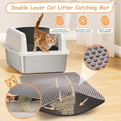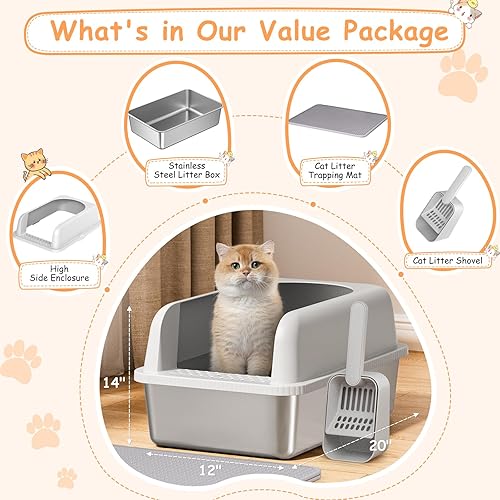 Value package: You will get stainless steel cat litter box x1,Plastic high side lid x1,Plastic cat litter scoop x1,Double cat litter mat x1,English instruction manual x1. Independent storage of cat litter spoon, place hygienic and convenient; Double litter mat When the cat jumps to play, will store stray cat litter, keep the floor clean and tidy at the same time, double litter mat design will help you save cat litter