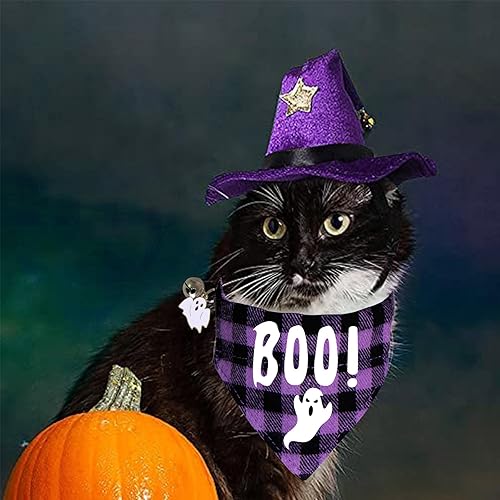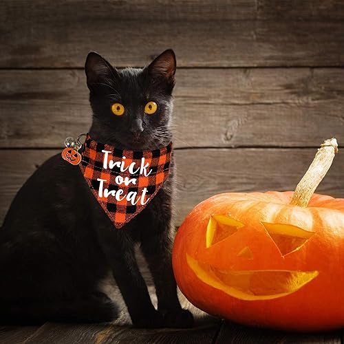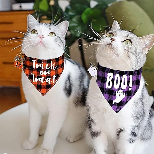 HALLOWEEN CAT COLLARS: The package contains 2 pack different designs of Halloween cat bandana collars with bell and Halloween pumpkin & ghost ornaments. Cute cat bandana collars make your cat lovely in Halloween party.