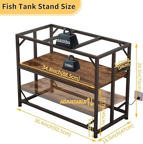 【DURABLE & STURDY FISH TANK STAND】The Metal Fish Tank Stand measures 36.4" W x 18.5" D x 30" H, engineered with heavy-duty steel and premium particle board to support up to 660 lbs. Its adjustable feet ensure stability on any surface, making it the perfect choice for your aquarium stand or terrarium stand.