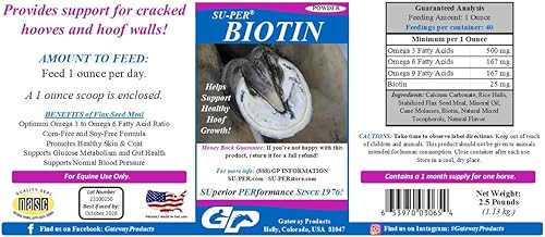 FEEDING NOTE: 25 mg of Biotin daily for horses with damaged hooves or a history of poor hoof health. SU-PER Biotin provides this amount of biotin per 1 ounce serving.