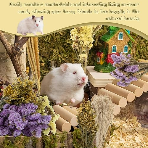 A Gift from Nature: The hamster decoration is a unique gift for the cute little hamster. The yellow and light purple forget-me-not flowers, the golden reeds and oriole flowers, and the green oat and oriole flower branches are the colors of nature. The elements of flowers and plants create a natural and fresh atmosphere for the hamster. Space, hamster decoration allows hamsters to feel more natural elements and smells, and sit and play comfortably and happily