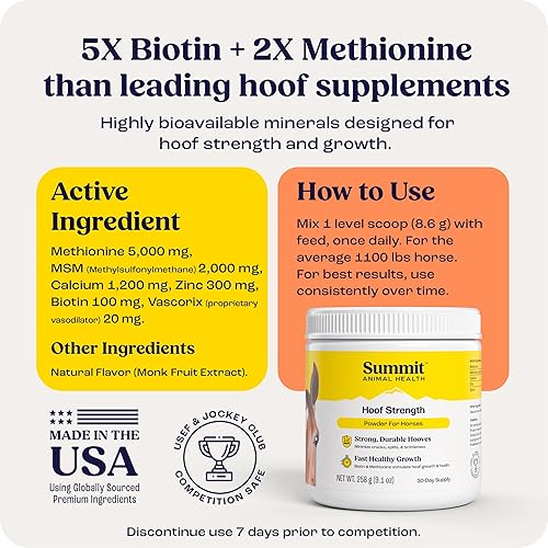 5X Biotin & 2X Methionine for Superior Hoof Health – Outperform leading hoof supplements with 5X more Biotin and 2X more Methionine per scoop, promoting consistent hoof growth and fortifying hoof walls to prevent cracks and brittleness.