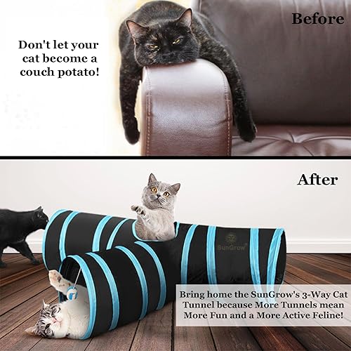 ENCOURAGES HEALTHY & FUN TIME --- An active cat is always a happy cat. The blue and black 3-way Cat Tunnel by SunGrow will surely make your kitties healthy in a fun way. They will be able to stretch their muscles as they run while being curious and excited about what’s on the other side. While you are working, give them some lone time in their tunnel. Let your furry pal toss, roll, and kick either for solo exploration or along with his pals.