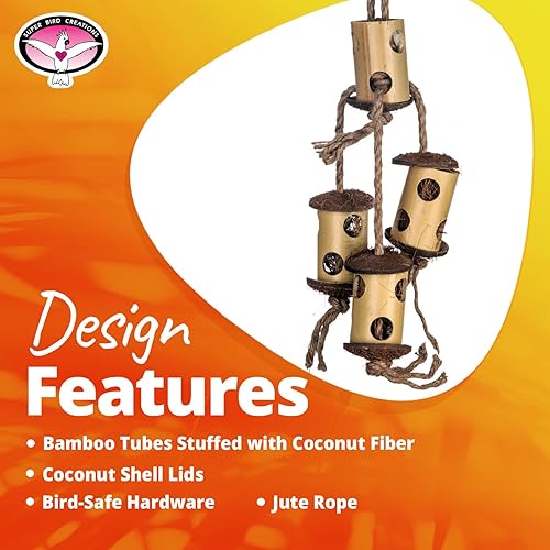 INTERACTIVE BIRD TOY DESIGN: The Bamboo Climb & Forage Bird Toy features bamboo tubes stuffed with coconut fiber, coconut shell lids & jute rope design that is perfect for foraging fun by hiding treats in the bamboo tubes. This encourages natural behaviors and keeps your bird mentally sharp and active.