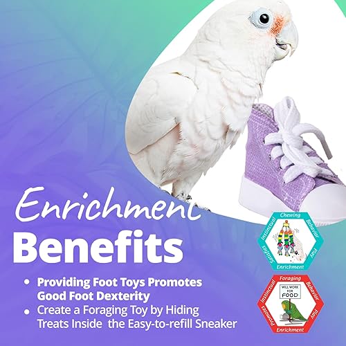 ENRICHMENT & FORAGING FUN: Sneakers aren't just great foot toys; they also encourage foraging when treats are hidden inside. This promotes good foot dexterity and provides a fun outlet for birds, both inside and outside their cage.