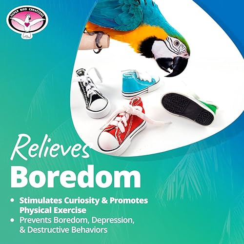 ENGAGEMENT BEYOND PLAY: More than mere toys, Super Bird Creations' sneakers are designed to alleviate boredom and prevent negative behaviors. They stimulate physical activity, curiosity, and mental engagement in parrots.