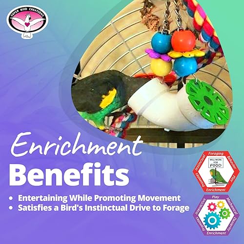ENRICHMENT BENEFITS - the PVC Forager bird toy is designed to not only entertain but also to help satisfy a parrot's instinctual drive to forage. Foraging devices require birds to search for their food. Placing foraging toys at various levels in the cage will promote movement.