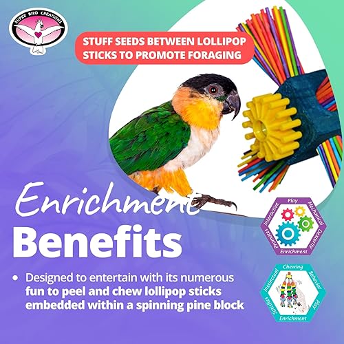 BEHAVIORAL BENEFITS: The Twirl n' Whirl goes beyond being a mere toy, standing as a hub of engagement for birds. Ingeniously packed with chewable lollipop sticks and crafted to rotate, it stimulates instinctive foraging behaviors. This is particularly effective when seeds are concealed inside, making it an outstanding resource for bird training and encouraging mental stimulation.