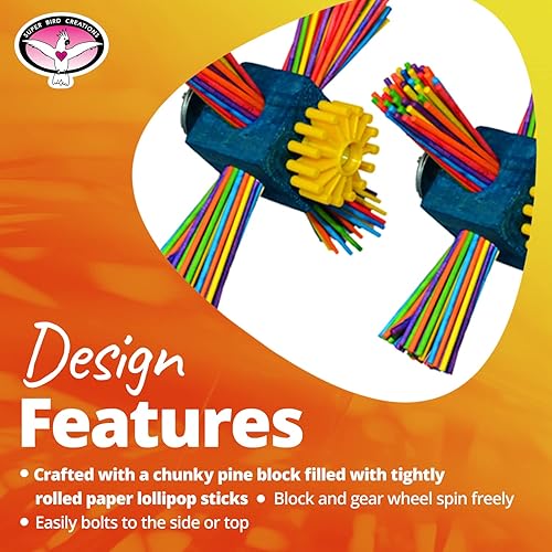 HANDCRAFTED DESIGN: This parrot chew toy features a pine block intertwined with a multitude of finely rolled paper lollipop sticks. Engineered for engaging dynamics, both the block and gear wheel rotate effortlessly, adding a lively twist to playtime. Its hassle-free attachment to any cage makes it a charming addition to your feathered friend's habitat.