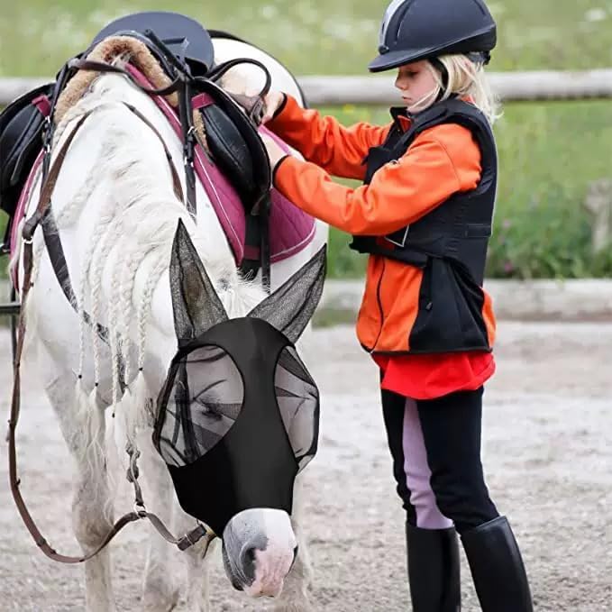 Easy to wear: the horse fly mask overs the face from the horse's ear to the forehead, which is stretchy and flexible to wear without discomfort, elegant and practical for daily wear