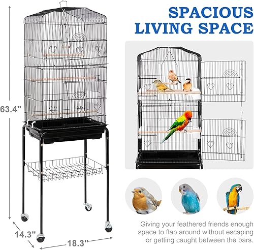 ✔ 2in1 Unique Design - This fade resistant bird cage has a handle that makes it easy for you to carry . Set on 360 degrees swivel casters, the bottom rolling stand allows the cage to be moved around the house without much effort. The design of extra storage shelf makes full use of the bottom space of the rack, suitable for placing bird feeds, toys and cleaning tools, handy and organized.