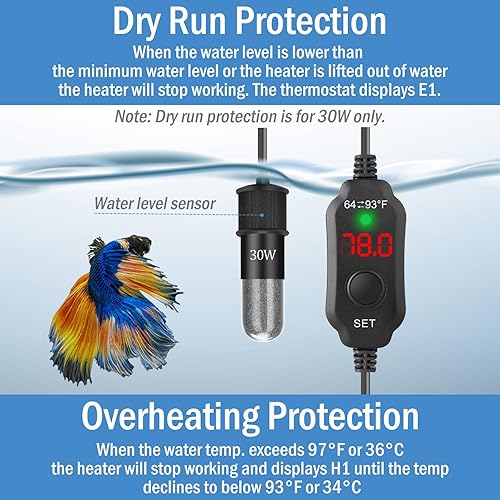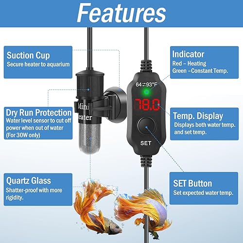 OVERHEATING PROTECTION – Safety is a top priority. This mini fish tank heater automatically shuts off when the water temperature exceeds 97°F. You can rest assured that your fish will be safe from overheating.