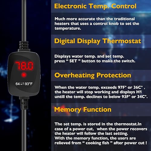 MEMORY FUNCTION – The thermostat conveniently stores the last temperature setting. In the event of a power outage, the mini fish heater will resume its previous setting once power is restored, eliminating the need for manual adjustment.