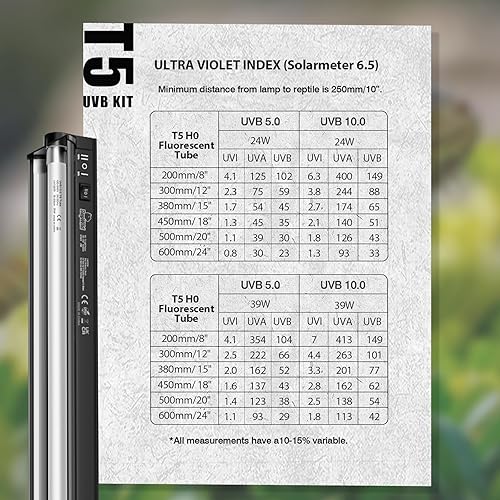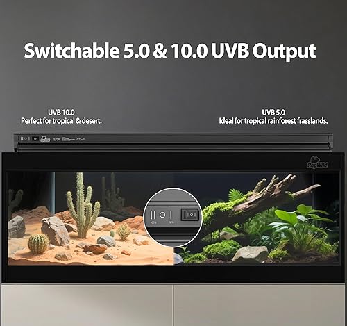 Dual UVB Spectrum Switch for Reptiles: Seamlessly toggle between UVB 5.0 (rainforest species) and UVB 10.0 (desert reptiles) modes. Perfect for bearded dragons, chameleons, leopard gecko, crested geckos, blue tongue skink and tortoises at all life stages with T5 UVB reptile light efficiency.