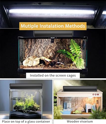 [Universal Compatibility]: 12" fixture fits all mesh-top terrariums (wooden/vivarium/glass). Includes 5.9ft detachable cord, screw kit & flame-retardant end caps. Installs in 3 ways: mesh mounting, ceiling suspension or side-wall fixation.