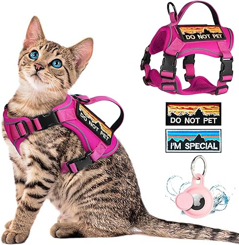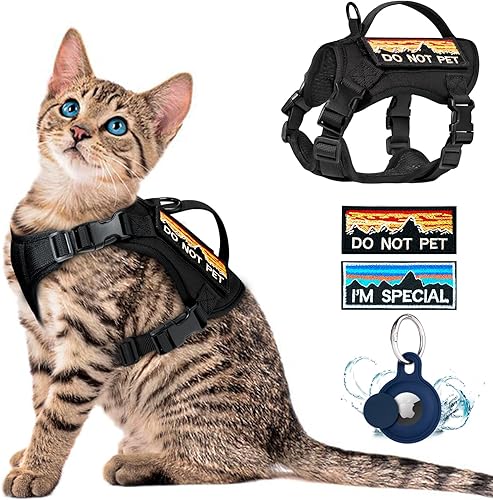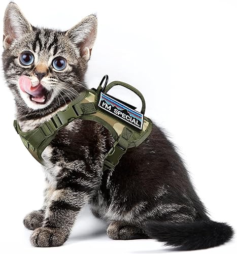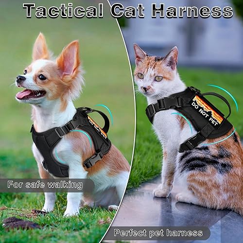 Durable and Comfortable:Made of 1050D nylon material with reinforced stitching, soft breathable mesh padded for comfortable fit while preventing pulling and choking.Fit for adult large cat and xsmall dog.Neck Girth: 9-12.6inch, Chest Girth: 13.7-19inch. Package include: 1×tactical cat harness,2 pack embroidered patches.