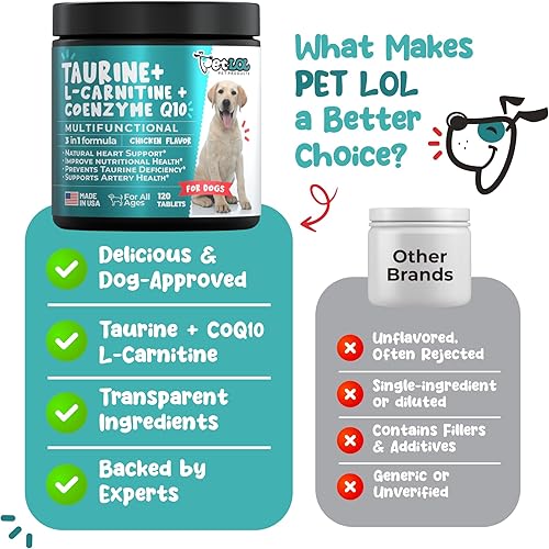 HEALTHY HEART: As amino acids, taurine and L-carnitine strengthen a canine's most important muscle: its heart. By supplementing your dog's diet with a boost of taurine and L-carnitine, its blood can flow efficiently and reduce the risks of disease, dilated cardiomyopathy (DCM), congestive heart failure (CHF), heart murmurs, arrhythmia and other heart conditions.Taurine supplementation is recommended by vets for dogs suffering from taurine deficiency and heart diaseas.*
