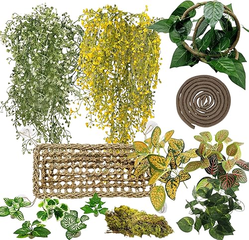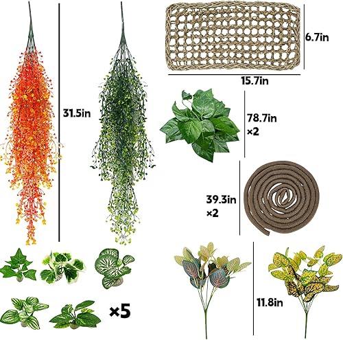 【Package includes】1 x Bearded Dragon Hammock, 2 x Vines, 2 x Rattans, 2 x Leaf Decorations, 2 x Big Leaves, 5 x Small Plant Decor, 1 x Hygrometer. Also includes matching suction cups. These bearded dragon tank accessories are the perfect reptile tank decorations.