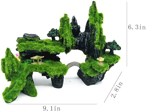 · DETAILS-The aquarium mountain view decoration surface is covered in green moss to add a touch of green to your aquarium. which help to create a more natural landscape,The fish tank mountain decor is also dotted with pavilions and bridge.