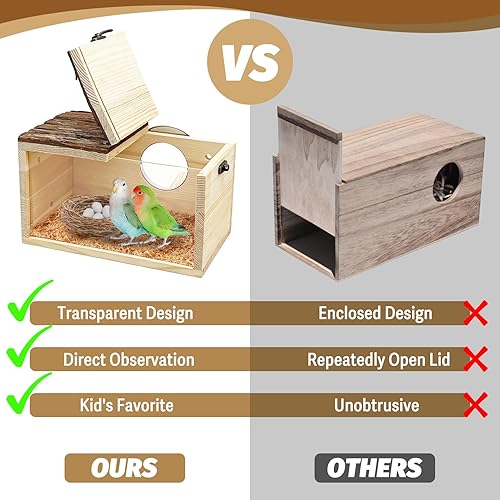 Unique Design: Wooden acrylic transparent bird box provides you with a clear view; convenient for you to easily observe the internal situation; so that children can easily watch the breeding and hatching process of birds; you can also easily observe the condition of the newborn bird; special design to meet the curiosity of you and your children; no need to repeatedly open the lid without disturbing the birds; bark texture design on the cockatiel nesting box gives it a natural appearance; bring a sense of security to the birds; Good for hatching baby birds