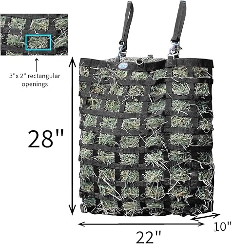 Holds 2-3 Flakes of Hay – This 22"x10"x28" hay bag with 3"x2" rectangular openings holds approximately 2-3 flakes of Timothy, Orchard, Alfalfa, or other types of hay. Designed for easy filling and minimal hassle.