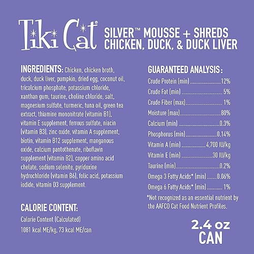 Comment on "Tiki Cat Silver Variety Pack, Immune System Support Formulated for Older Cats Aged 11+, Senior Wet Cat Food, 2.4 oz. Can (12 Count)(Chicken- Duck & Duck Liver)"