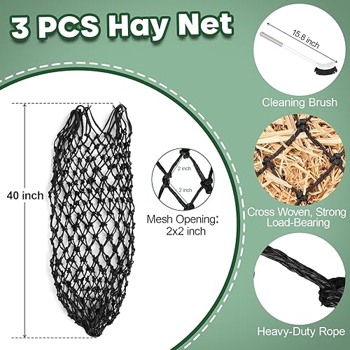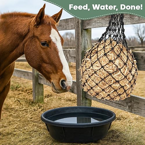 7-in-1 Horse Feed Pan Set: 3× 2gal/8qt rubber feed pans, 3× 40" slow-feed hay nets (2" mesh), 1× cleaning brush—everything you need for horse feed