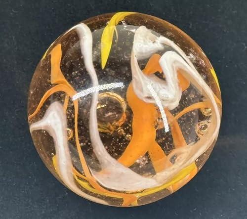 Clear glass marble with orange, yellow and white spaghetti swirls. Each one has a bubble or two in the center