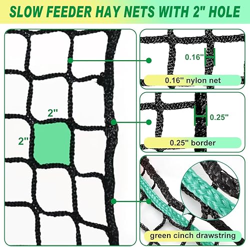 Knotless Hay Net: Knotless Nets are soft on the horse's gums and mouth. The knotless design of our hay net is kindly for horse natural tooth wear and reduces the risk of dental issues.For horses prone to obesity.The use of slow hay feeding nets can control their eating speed and prevent excessive intake, thereby helping horses maintain their ideal weight.