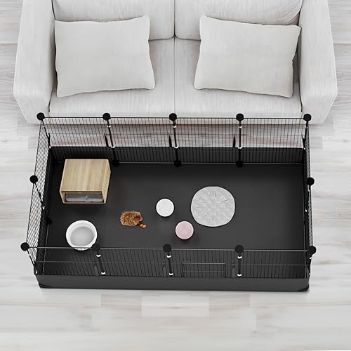 Assembled Size: Our cage liners for small animals has a size of 48 x 24 inches after assembly, and it's also only suitable for 48 x 24'' fence. Just unfold the base mat, place the fence inside the base mat, and finally hang the hook on the crossbar on the fence (the height that the hook can reach is 10.2-11.8 inches). Paired with panels (not in the package) to form a small animal playpen, this product is suitable for guinea pigs, bunnies, hedgehogs, kitty, etc.